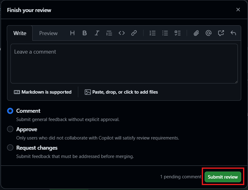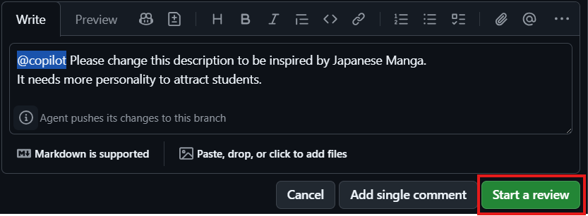 - You can type any message into the review field to share your thoughts with other humans, Copilot will ignore those. To give additional instructions to Copilot, start the message with @copilot