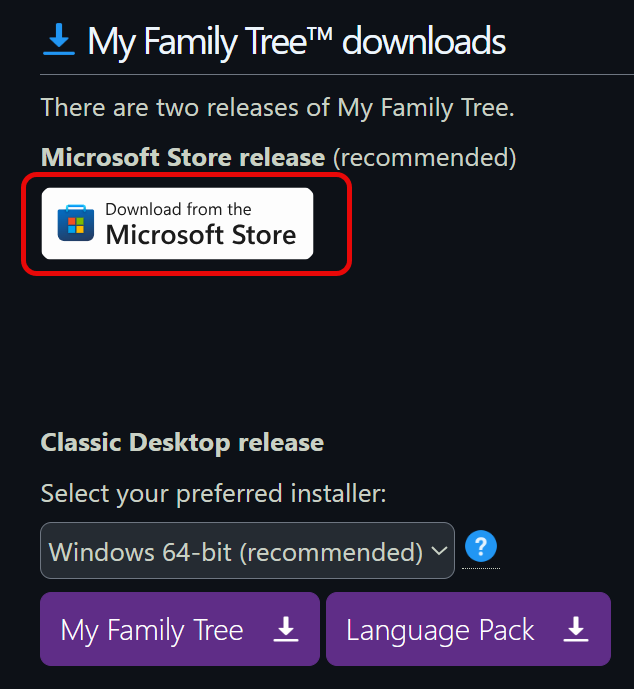 - Töltsd le a telepítőt. The Microsoft Store verzió az ajánlott. A klasszikus “desktop” program is elérhető ( My Family Tree classic ) a nyelvi kiegészítőkkel (Language Pack)