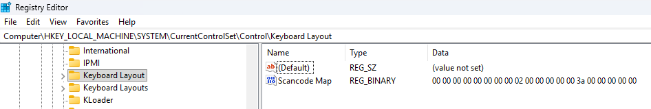 Scancode Mapbinary value to the HKEY_LOCAL_MACHINE\SYSTEM\CurrentControlSet\Control\Keyboard Layout key with the value