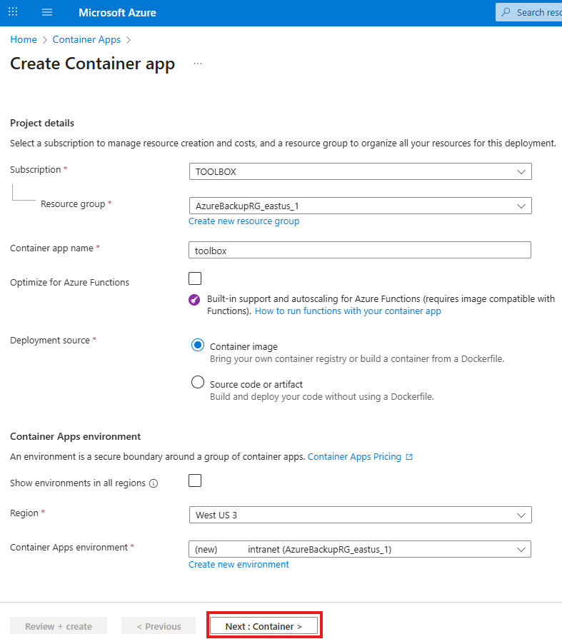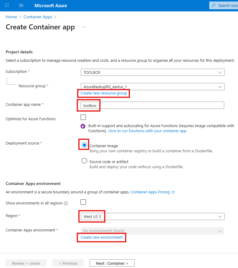 - Create a new Resource Group if needed, enter the app name (all lower case characters), select the Region. Select the environment, or click the Create new environment link. The West US 3 is the newest region in the west, located in Phoenix, Arizona, and provides Availability Zone support. Although West US is located in California, but does not provide availability zone support. Availability zone support offers very important redundancy within the same region in case of network and power outage, and natural disasters. The data transfer between availability zones within the same region is free, and many services can utilize the redundancy.