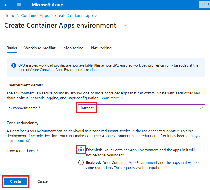 - Enter the environment name, and select the zone redundancy, and click the Create button. For non mission critical apps the zone redundancy is usually not necessary, as it doubles the infrastructure cost.