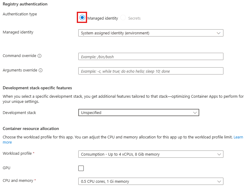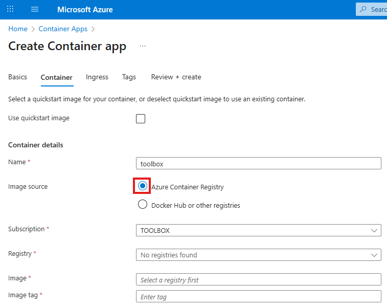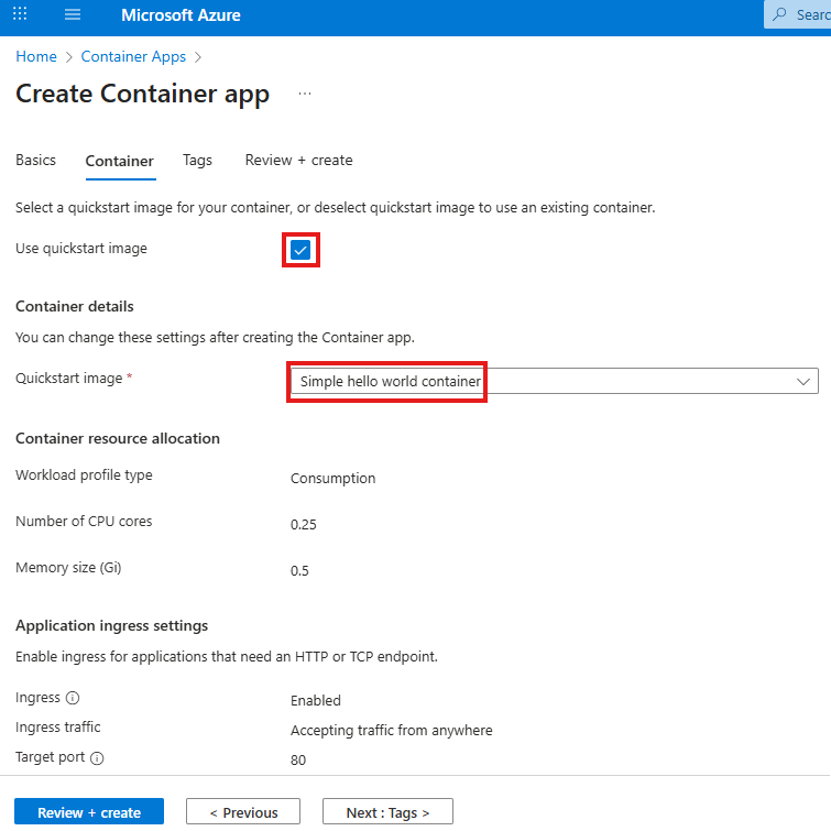 - If there is no available container image to deploy, select Use quickstart image. This will deploy a temporary Hello World web application.