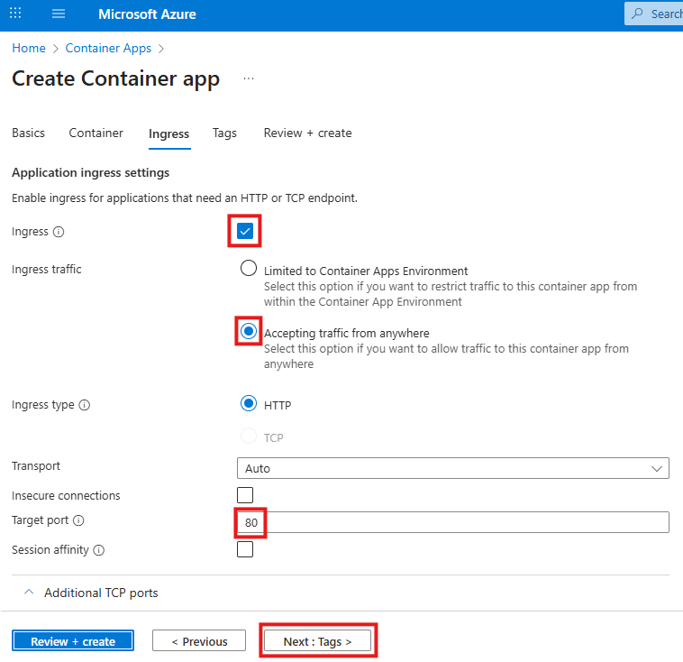 - For web applications enable ingress and traffic from anywhere, set the port to 80. Click the Next: Tags button