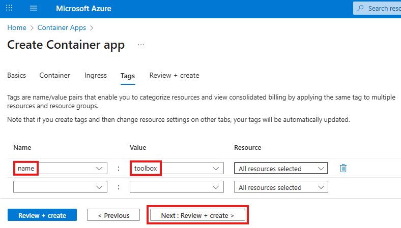 - Add a name tag to the application for cost tracking, and click the Next: Review + create button
